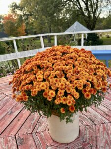 We haven’t had a hard frost yet, so gardens are still sporting some of their late summer blooms, with a few potted mums thrown in for good measure. The trees are starting to show their fall colors, and a few have begun shedding their leaves.